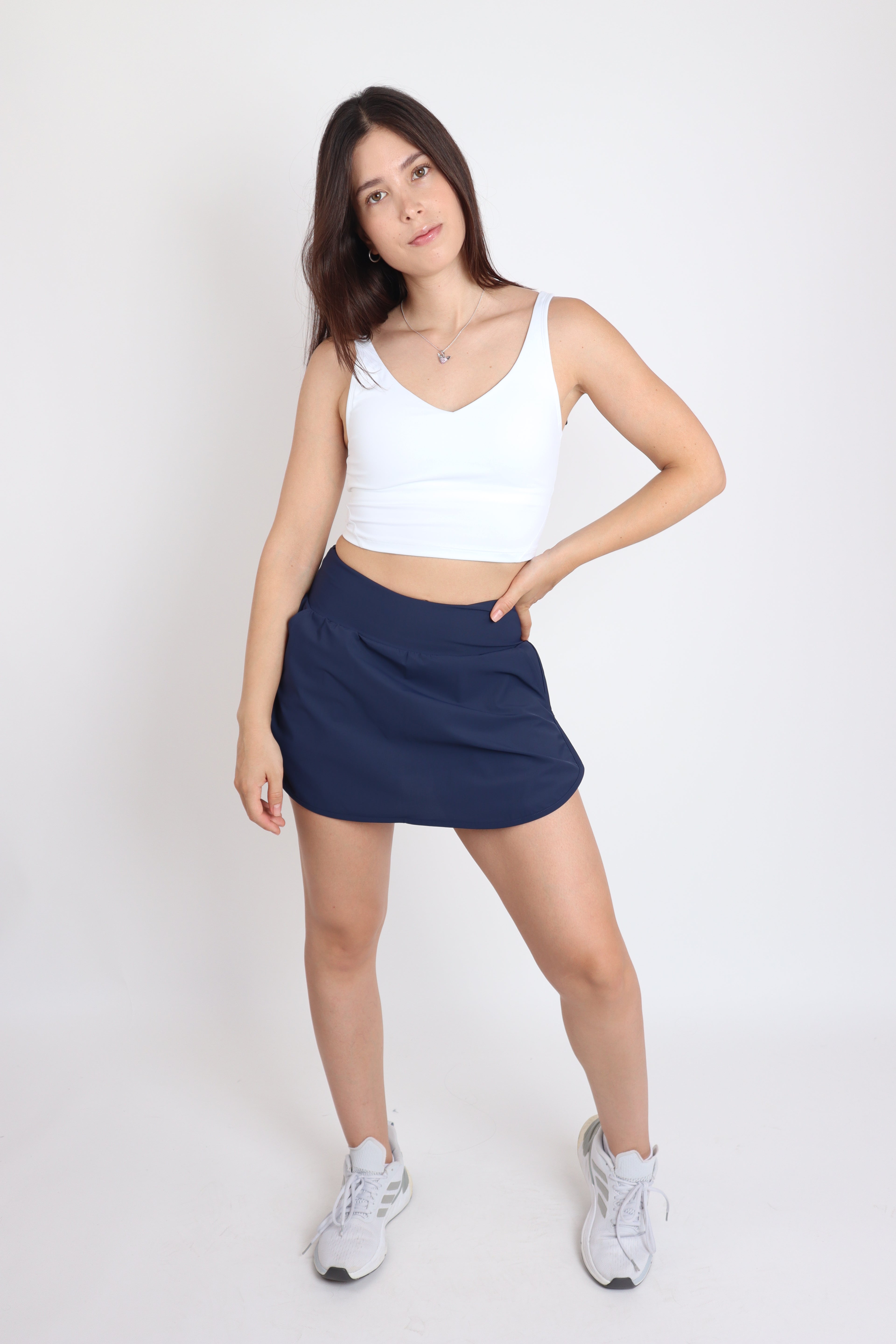 Falda de corte plano confeccionada en tela ligera tipo windproof, ideal para moverte con libertad. Su diseño minimalista la hace versátil, cómoda y perfecta para un look deportivo o casual.