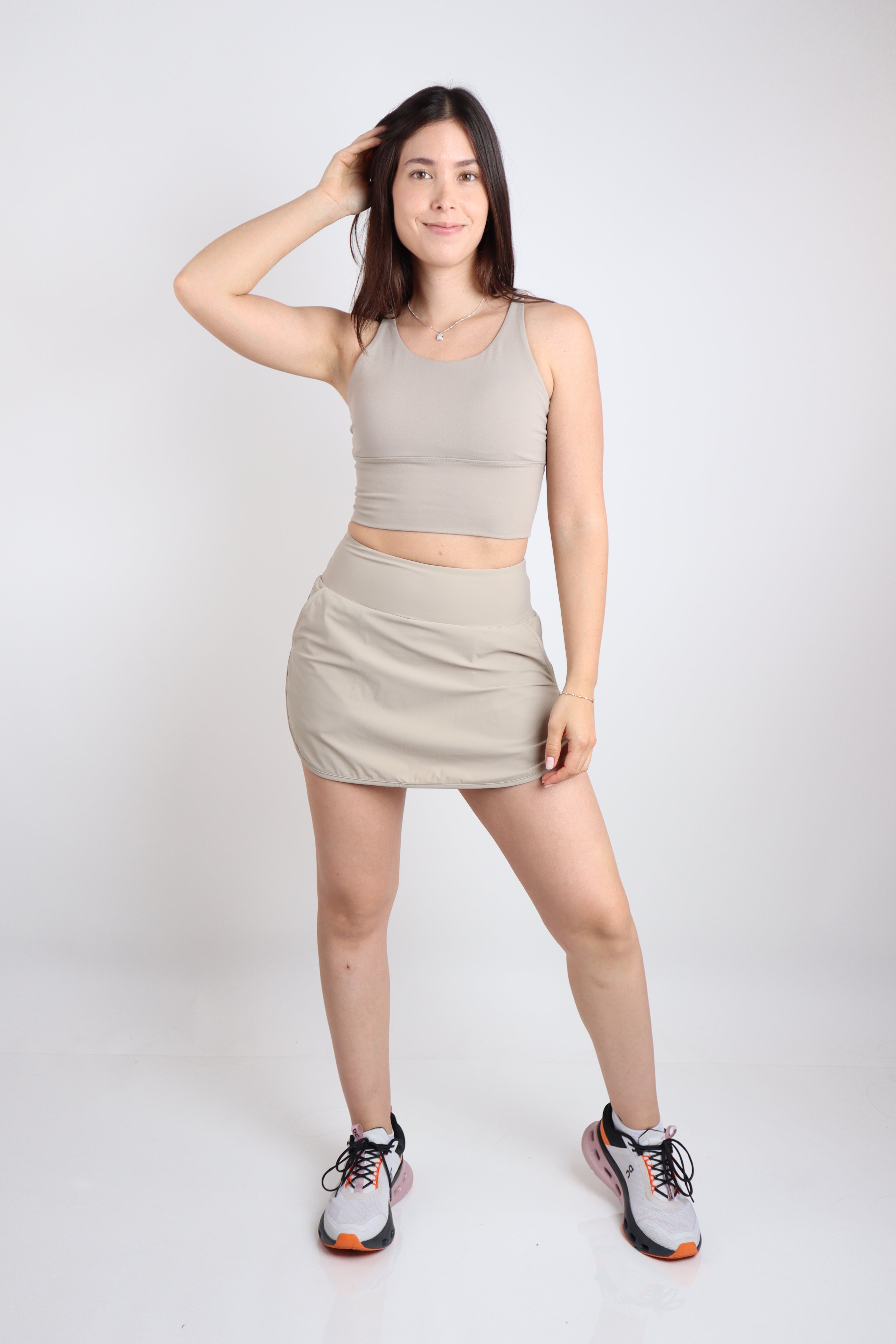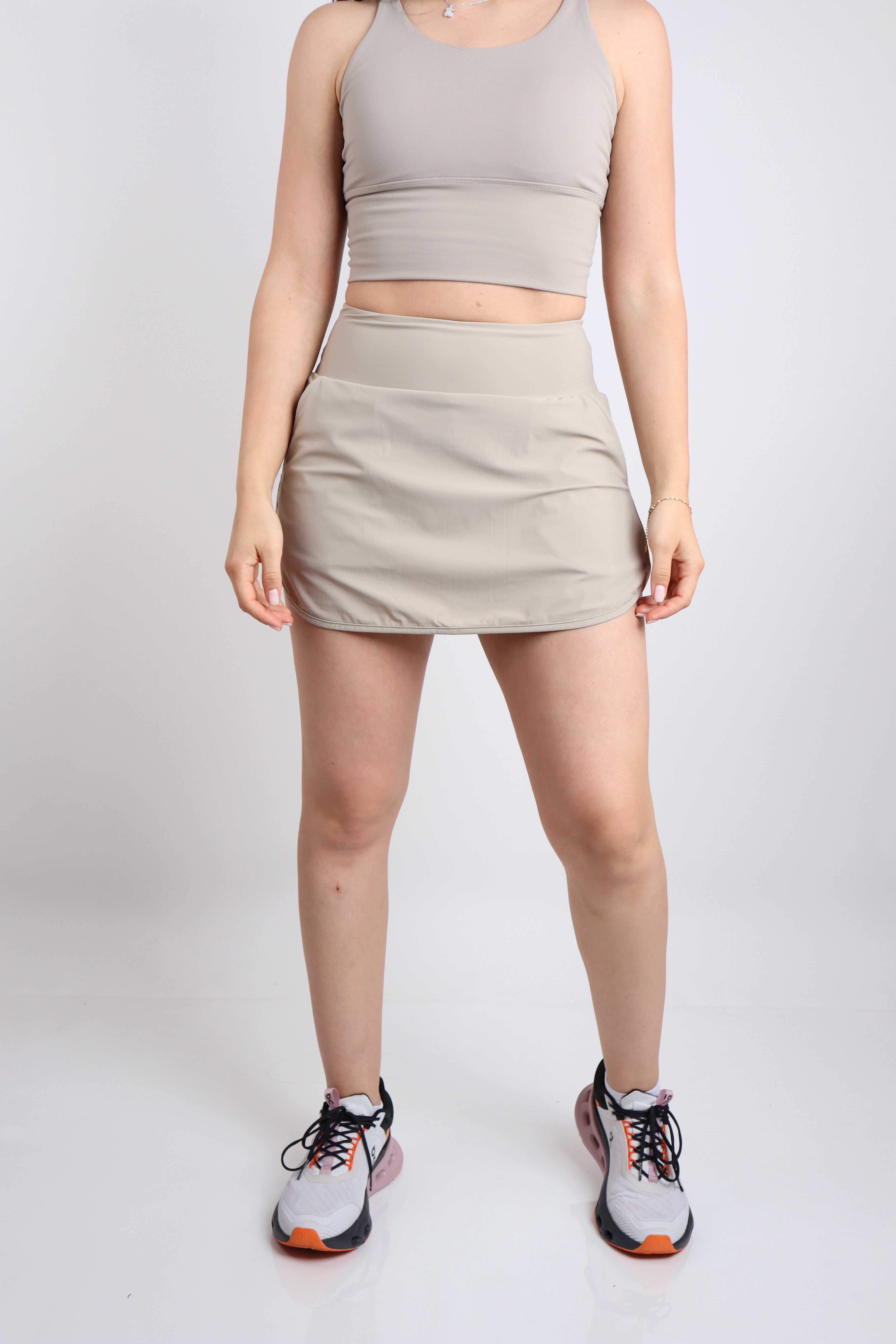 Falda de corte plano confeccionada en tela ligera tipo windproof, ideal para moverte con libertad. Su diseño minimalista la hace versátil, cómoda y perfecta para un look deportivo o casual.